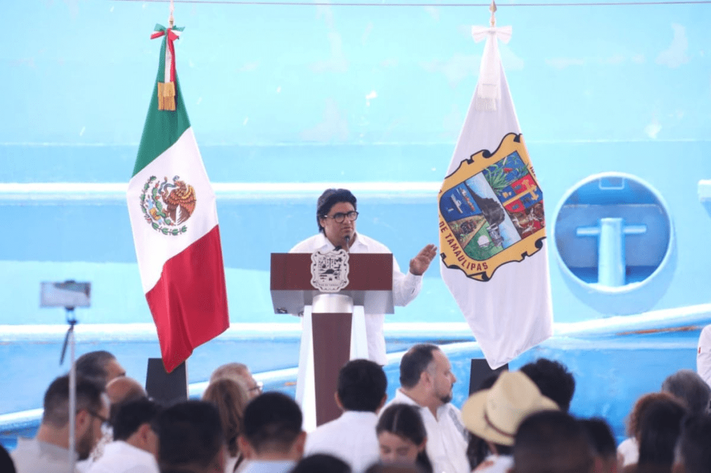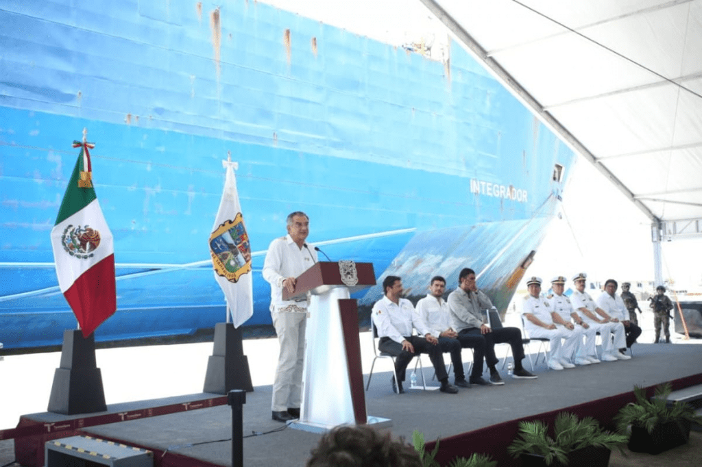 Luego de dar el banderazo al embarque de los primeros vehículos que ingresaron al buque «Integrador», anclado en el muelle del puerto, y tras recibir el título de concesión que autoriza iniciar operaciones portuarias, de manos del almirante José Barradas Cobos, subsecretario de Marina Mercante, el gobernador aseguró que, a partir de este día, Tamaulipas se convierte en la nueva frontera marítima de México.