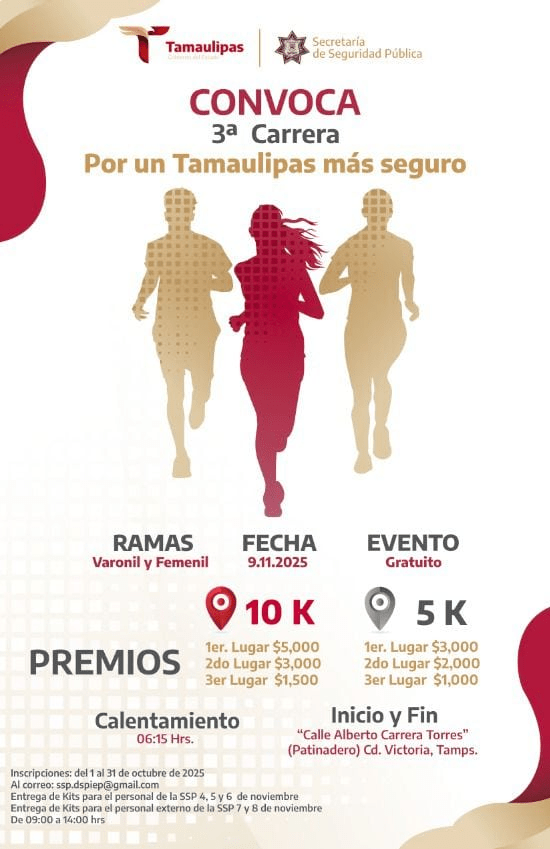 Ciudad Victoria, Tamaulipas.- Por tercer año consecutivo, la Secretaría de Seguridad Pública de Tamaulipas (SSPT) invita a la población en general a ser parte de la carrera conmemorativa del aniversario de la Guardia Estatal que se celebrará el próximo nueve de noviembre del 2025.